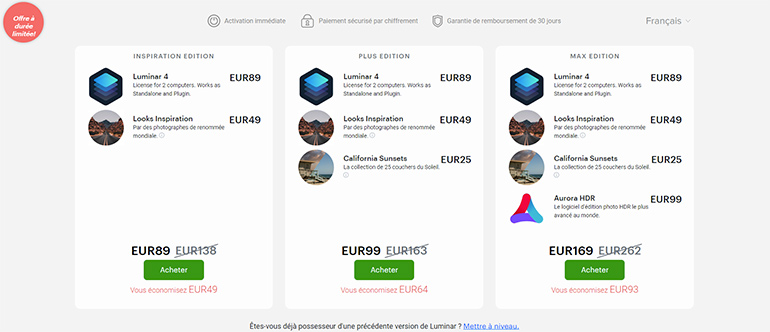Si c’est le cas, vous pourrez obtenir l’équivalent de l’Inspiration Edition (Luminar 4 + Looks Inspiration) au tarif préférentiel de 74 €. Cela représente 15 € d’économie par rapport à ceux qui achètent le logiciel pour la première fois.