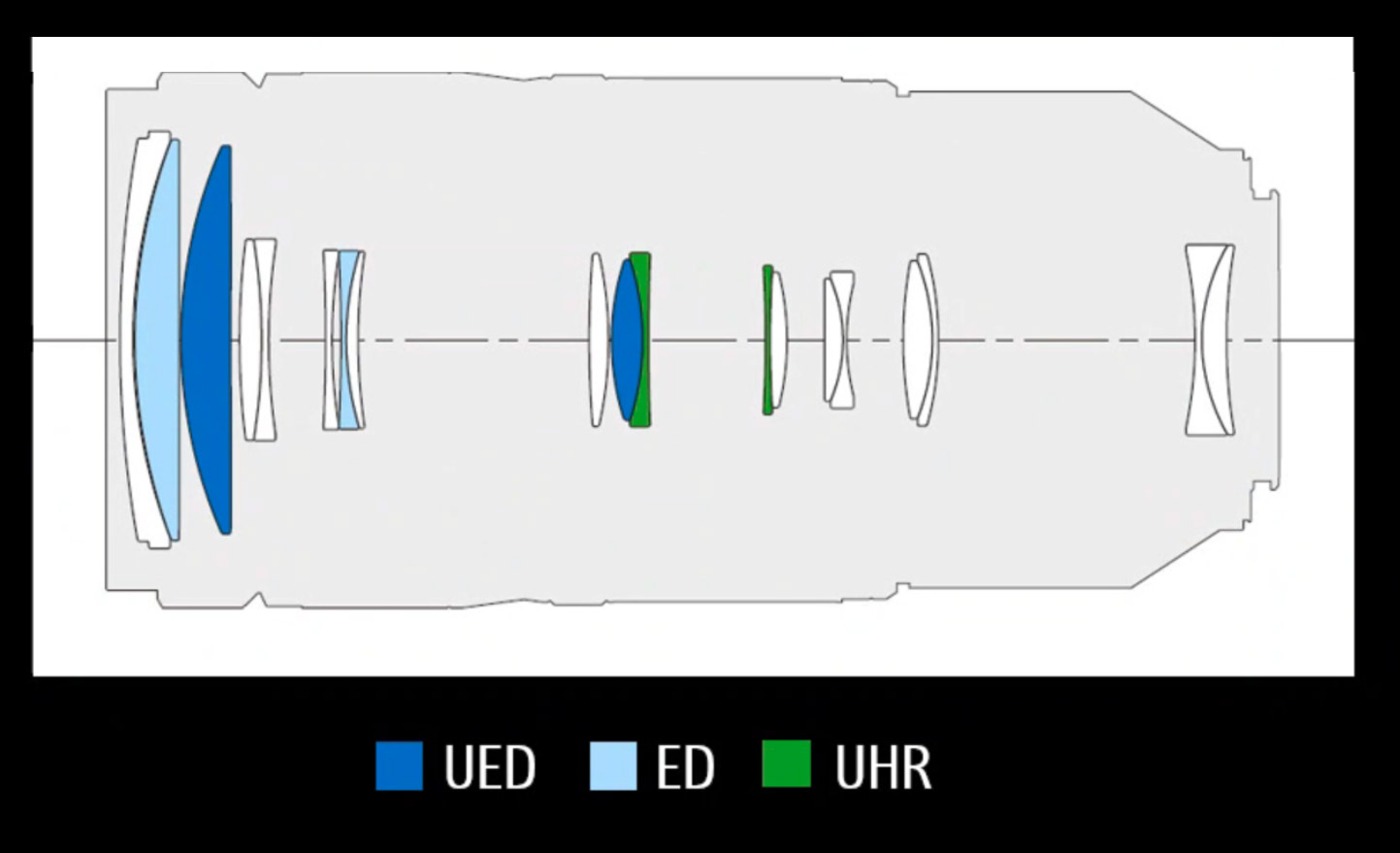 La construction optique s’architecture autour de 19 éléments associés en 12 groupes, avec des verres UED (2), ED (2) et UHR (2).