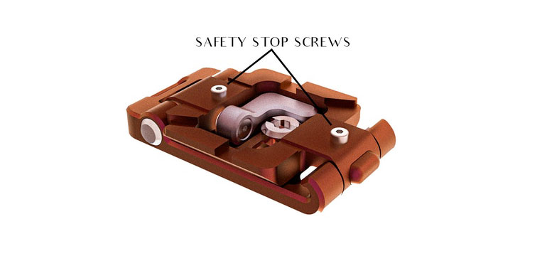 Pour une sécurité totale, un petit levier de verrouillage en forme de L est accessible, et une fois levé à la verticale, permet de bloquer la position. Il suffit ensuite de le rabaisser pour pouvoir revenir à la position initiale. Lorsque la position initiale a été retrouvée, le mécanisme se bloque automatiquement et la plaque de fixation retrouve sa forme initiale.