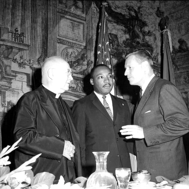 King with Archbishop of New York Francis Joseph Cardinal Spellman and Governor Nelson Rockefeller -