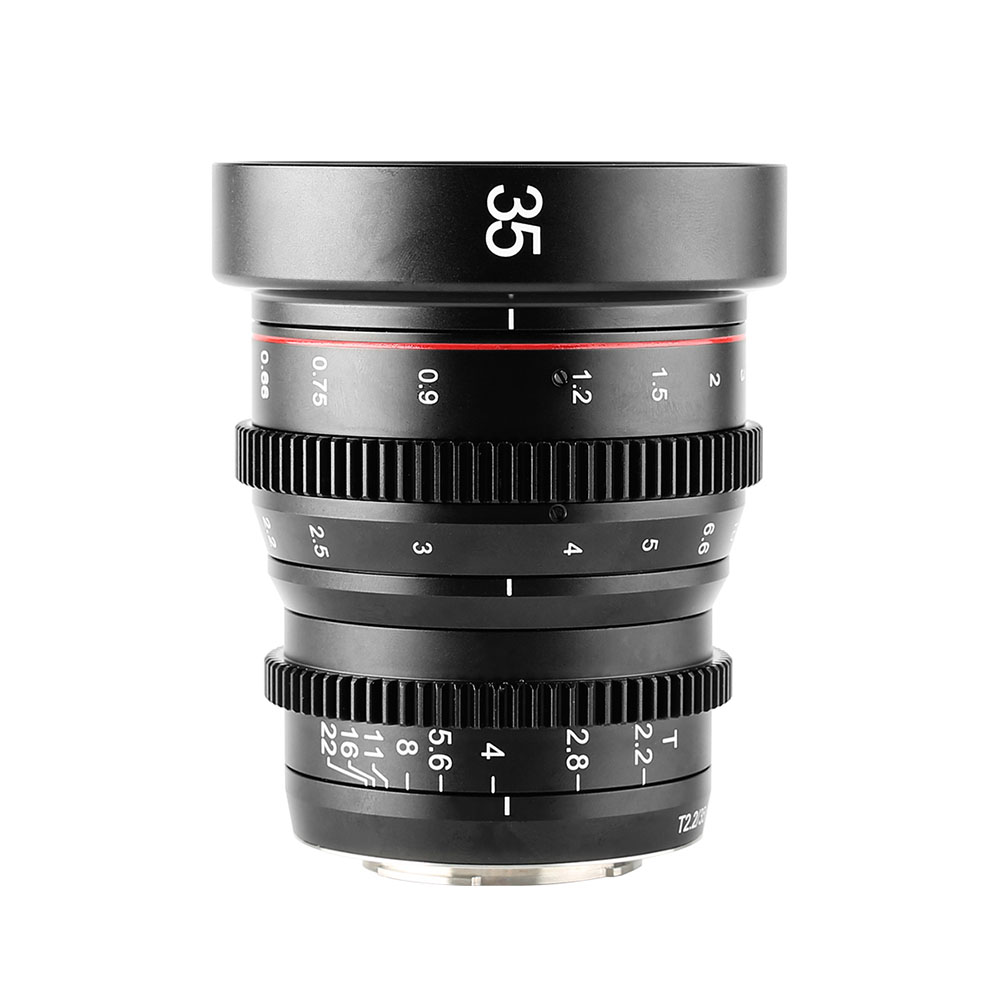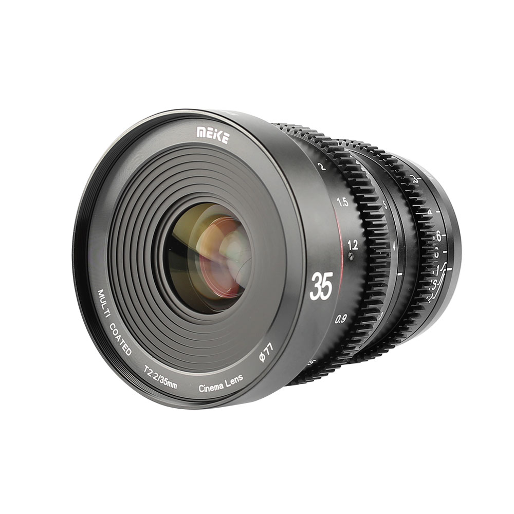 En tant que quatrième objectif cinéma de la marque, le Meike 35 mm T2.2 rejoints les optiques 12 mm T2.2, 16 mm T2.2 et 25 mm T2.2 au sein d’une gamme de focales fixes à mise au point manuelle. Contrairement à ce que l’on pourrait penser de prime abord, le nouveau venu ne constitue pas une déclinaison d’un objectif déjà commercialisé par Meike. Sa conception optique, basée sur l’utilisation de 10 éléments répartis en 8 groupes, se différencie donc de la conception du récent 35 mm f/1,4 (8 éléments répartis en 5 groupes), et du 35 mm f/1,7 (6 éléments répartis en 5 groupes).