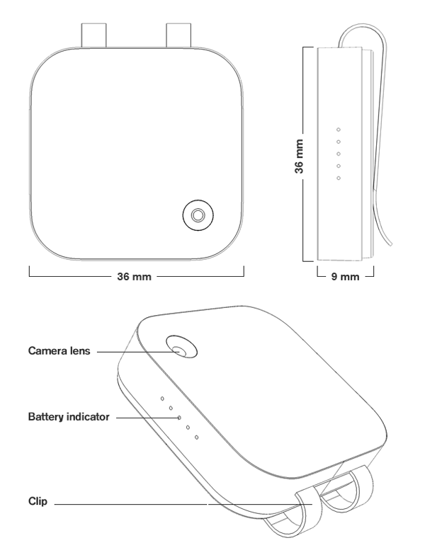 Memoto se présente sous la forme d’un petit boitier carré de 3,6 cm de côté, d’une durée de vie de 2 jours sans charge, et prenant des photos de 5 mégapixels environ toutes les minutes, coordonnées GPS incluses. L’objet est discret, suffisamment pour passer inaperçu sur le col d’un t-shirt, le revers d’une veste, sur une anse de sac ou un serre-tête (façon GoPro) et se décline en trois coloris : blanc, noir, orange.