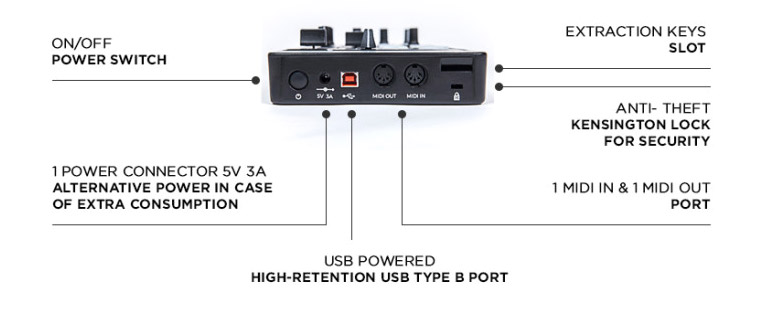 - Ports : 1 x USB type B, 1 x DIN MIDI IN, 1 x DIN MIDI OUT