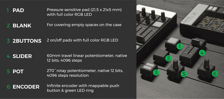 Ce contrôleur midi propose une surface d’accueil de taille fixe, sur laquelle on insère les contrôleurs de son choix à l’emplacement de son choix en “plug & play”. On peut ainsi ajouter jusqu’à 32 contrôleurs, dans différentes orientations, automatiquement reconnues.