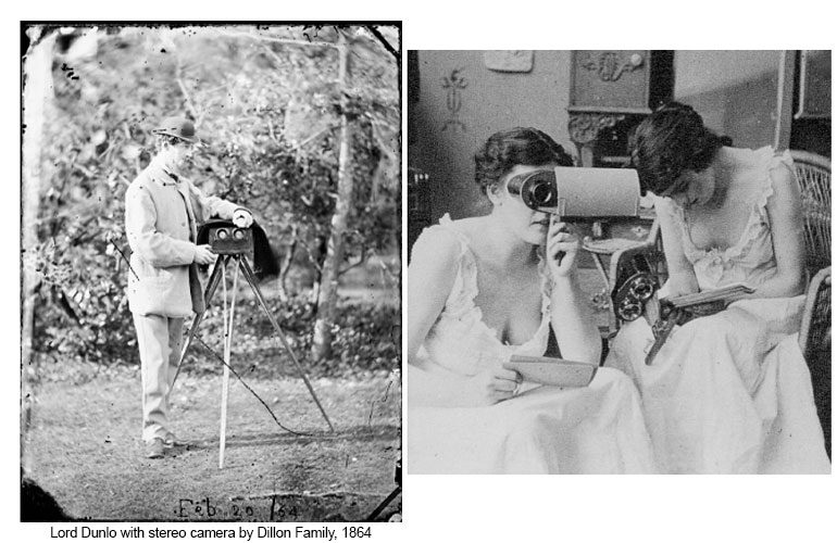 La photographie stéréoscopique utilise la capacité naturelle de notre cerveau à créer une image en trois dimensions à partir de deux images. Nos yeux étant éloignés, c’est la légère différence d’angle de vue qui crée la représentation en 3D de notre vision naturelle. Dès les années 1840, des appareils ont commencé à être testés pour reproduire cet effet. Le premier appareil utilisant des lentilles dans ce but est le stéréoscope de Brewster, qui apparaît en 1849. Ces appareils nécessitent aussi des solutions pour les visionner de manière isolée par chaque œil, afin de recréer l’effet 3D.