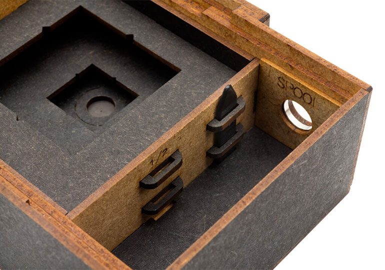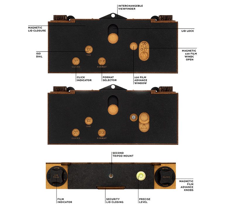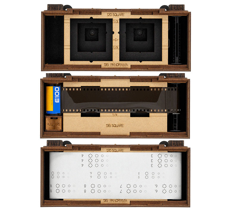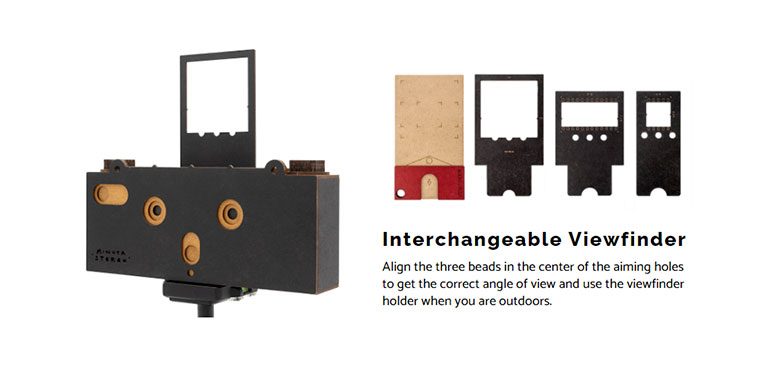 Cet appareil photo sténopé utilise deux minuscules trous espacés au lieu de lentilles (le principe du sténopé) de manière à recréer l’effet stéréoscopique désiré. Le tout est construit à partir de bois, offrant un style résolument vintage.