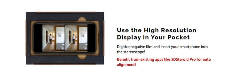 Vous pourrez utiliser votre smartphone pour numériser le film négatif, et l’insérer dans le stéréoscope. Des applications comme 3DSteroid Pro permettront en plus de bénéficier de l’alignement automatique.