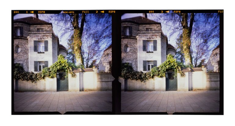 Deux trous d’épingle percés dans une fine feuille de laiton bruni de 0,025 mm permettent une exposition parfaitement identique des deux images réalisées en même temps.