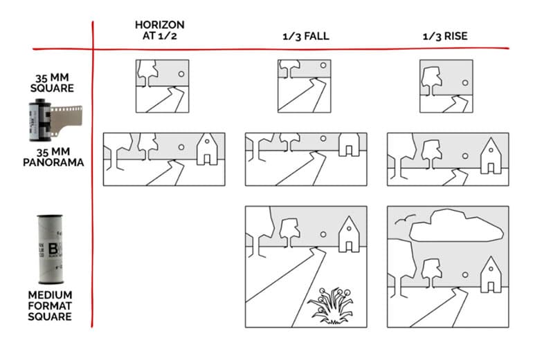Il est enfin possible de choisir le positionnement de la pellicule grâce à des adaptateurs. Ils permettent de déplacer l’horizon vers le bas ou vers le haut en fonction des besoins de composition.
