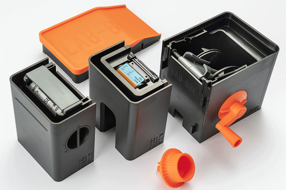 Développée par la société romaine ars-imago, la LAB-BOX est une boîte compacte et hermétique à la lumière, conçue pour faciliter le développement de négatifs aux formats 135 et 120. Compatible avec des modules correspondant à ces deux formats, le dispositif se compose d’une première partie dans laquelle il convient de placer le film à développer, et d’une seconde partie contenant un enrouleur et capable d’accueillir le bain de développement. Le couvercle placé sur le dessus de la boîte permet de réaliser toutes les opérations de développement en plein jour, sans risque de voiler le film. Il est de plus possible d’utiliser n’importe quel type de chimie.