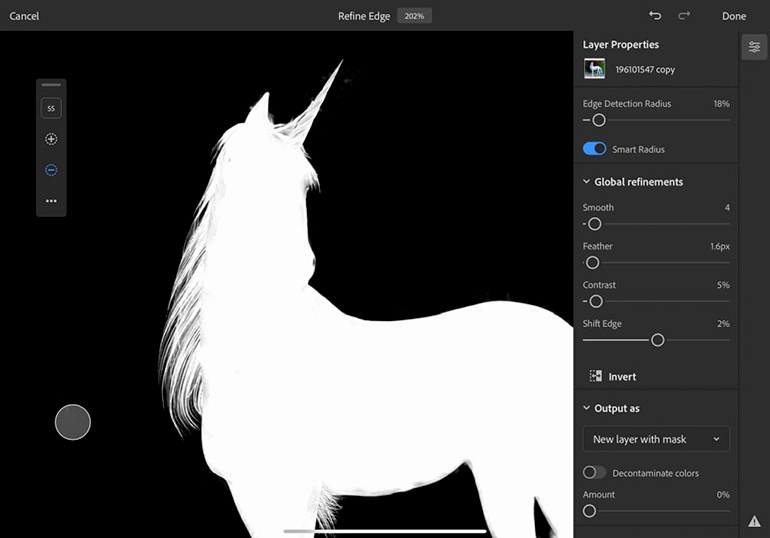 • Outil d’amélioration des contours : cet outil très apprécié après une sélection, comme par exemple une sélection de sujet, sera intégré à l’application lors d’une prochaine mise à jour