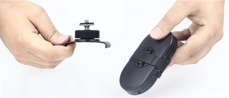 Mesurant 76 mm x 37 mm x 41 mm pour un poids de 47 grammes, la fixation peut supporter jusqu’à 7 kilos. Elle se fixe très simplement en remplacement de la fixation pince pour smartphone.