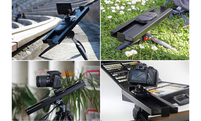 Les rails (ou sliders) sont des accessoires très utilisés pour réaliser des travellings. Se fixant sur un ou plusieurs trépieds selon leurs dimensions, ils permettent de réaliser des travellings dans différents angles.