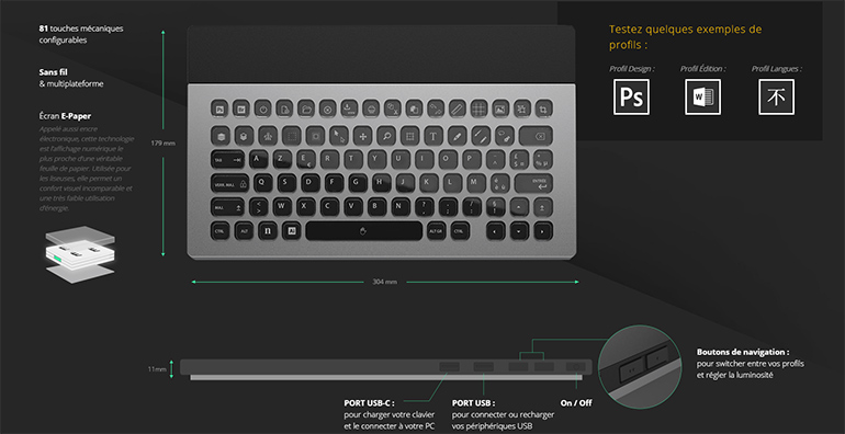Nemeio est un clavier d’un nouveau genre. Ses touches s’affichent grâce à de l’encre électronique, la même technologie d’affichage que celle utilisée dans les liseuses. Totalement personnalisables, les fonctions des touches peuvent ensuite être enregistrées dans des profils.