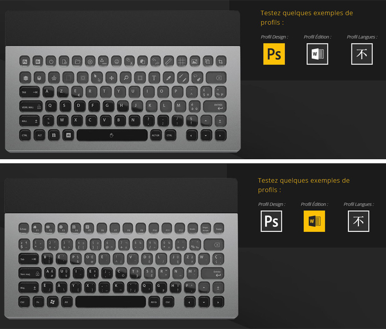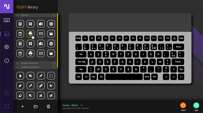 Il est ainsi possible d’assigner n’importe quel caractère ou raccourci à chaque touche du clavier. Une importante bibliothèque d’icônes est donc disponible, et classés par logiciels. Enfin, il est aussi possible de créer les siens.