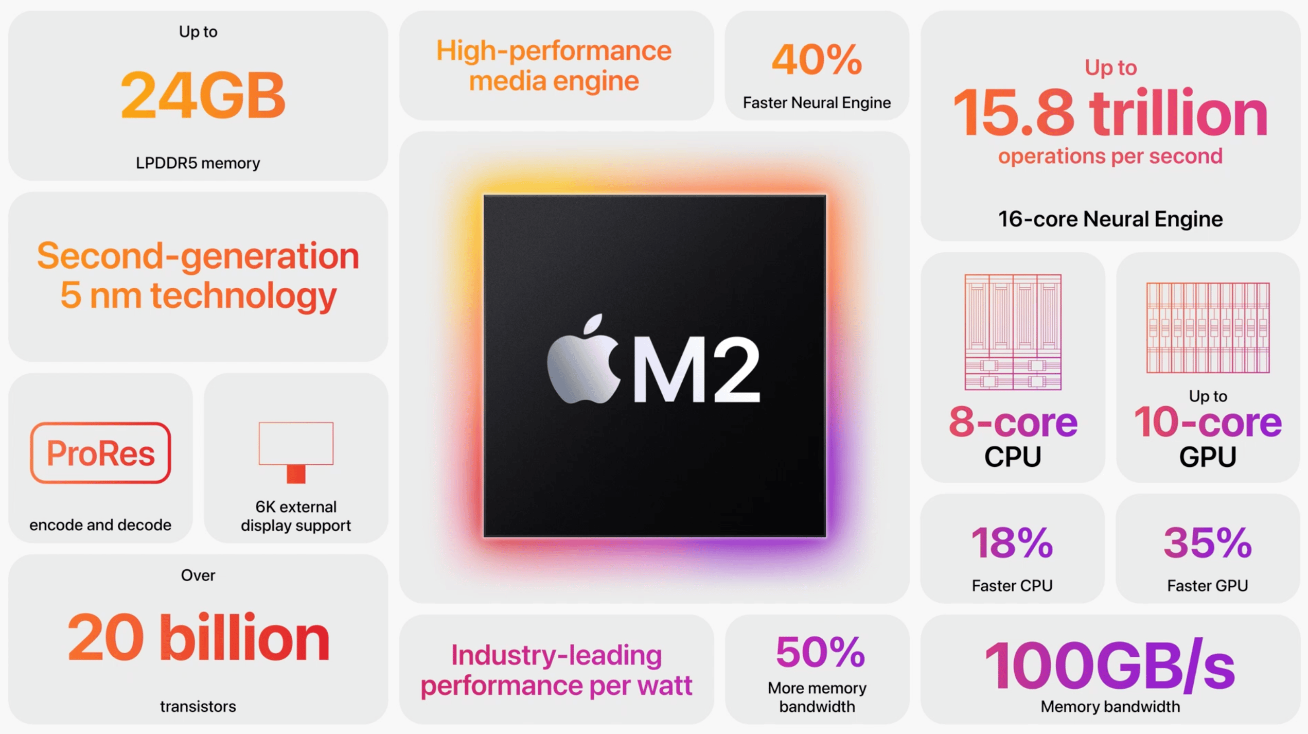 Le SoC (System on a Chip) M2 constitue la deuxième génération des puces « maison » Silicon et initie la relève des M1 (M1, M1 Pro, M1 Max, M1 Ultra). Cette puce M2 se veut bien sûr plus performante que la M1. Comme la M1 elle intègre 8 cœurs CPU et jusqu’à 10 cœur GPU (2 de plus que sur la M1). Autre nouveauté, la mémoire ! La puce M2 d’Apple gère désormais jusqu’à 24 Go de mémoire unifiée (16 Go pour la M1) avec une bande passante de 100 Go.