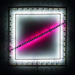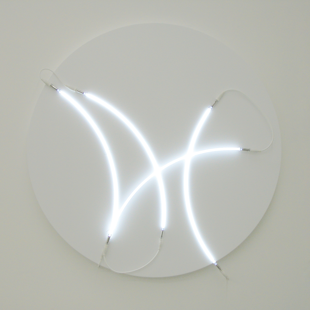 François MORELLET, Lunatique neonly, 4 quarts de cercle n°10, 2002, acrylique sur toile sur bois, 4 quarts de cercle de néon blanc répartis au hasard de π, 121 x 120 cm © Galerie Lélia Mordoch -