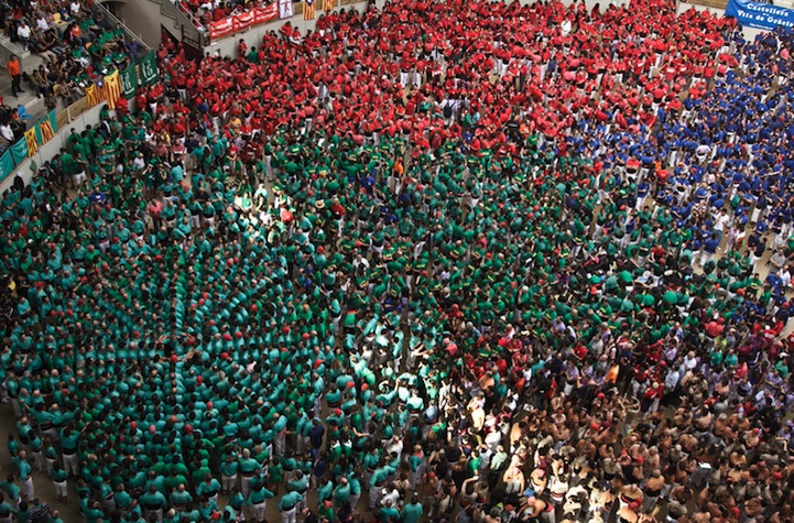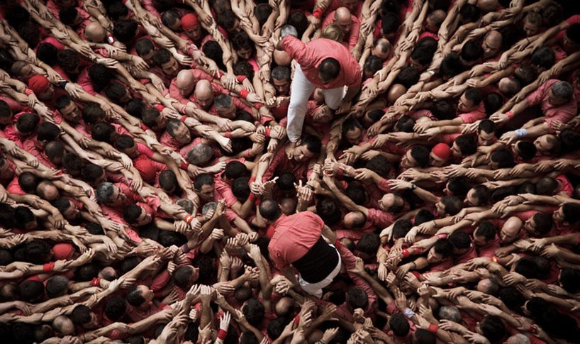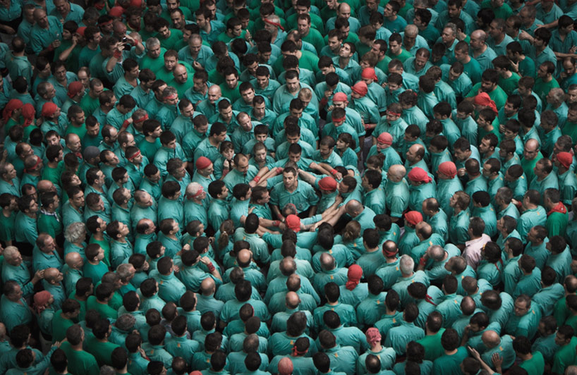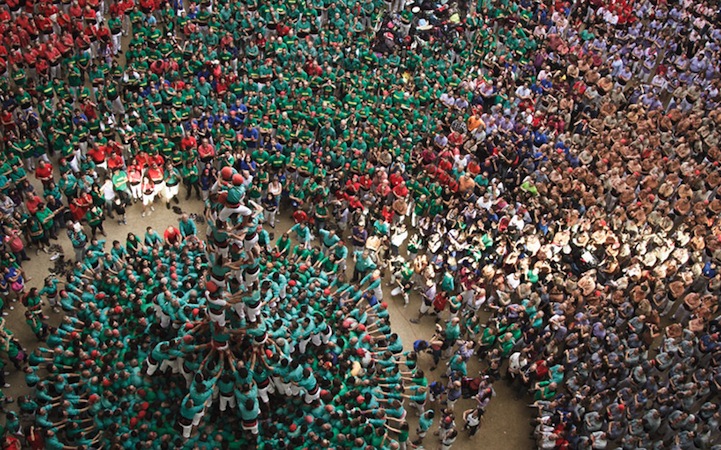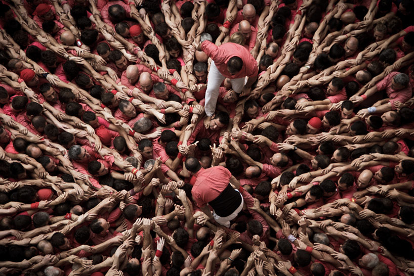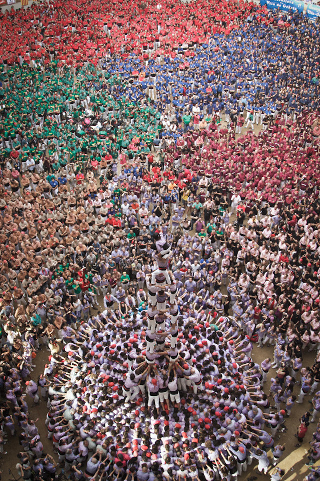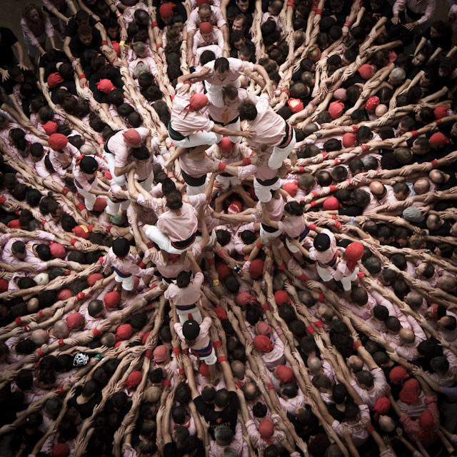 De six à dix étages, les tours humaines de Tarragone s’érigent tous les deux ans sous l’impulsion de 32 équipes d’hommes et de femmes, entre 100 et 500 membres pour permettre aux structures de prendre une forme aussi stable et solide que possible. Le photographe espagnol David Oliete offre pour l’édition 2012 son point de vue en hauteur. De ces « Castells » naissent des formes compactes, symétriques et éclatantes de couleurs. De véritables fourmis humaines si vous jetez un coup d’oeil à l’album Concurs de Castells sur Flickr.