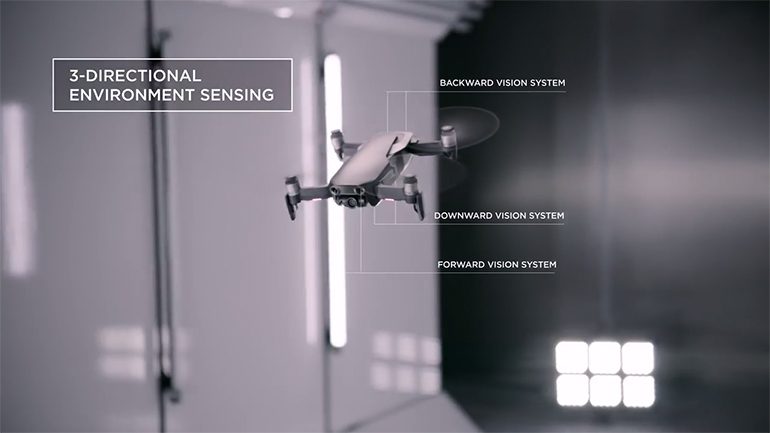Le système de capteurs visuels et infrarouge du Mavic Air est utilisé dans ce que DJI appelle FlightAutonomy 2.0. Il permet de détecter les obstacles jusqu’à 20 m à l’avant, ainsi que sur les côtés ou l’arrière du drone, et aussi de les éviter en temps réel, tout en laissant le drone continuer son chemin.