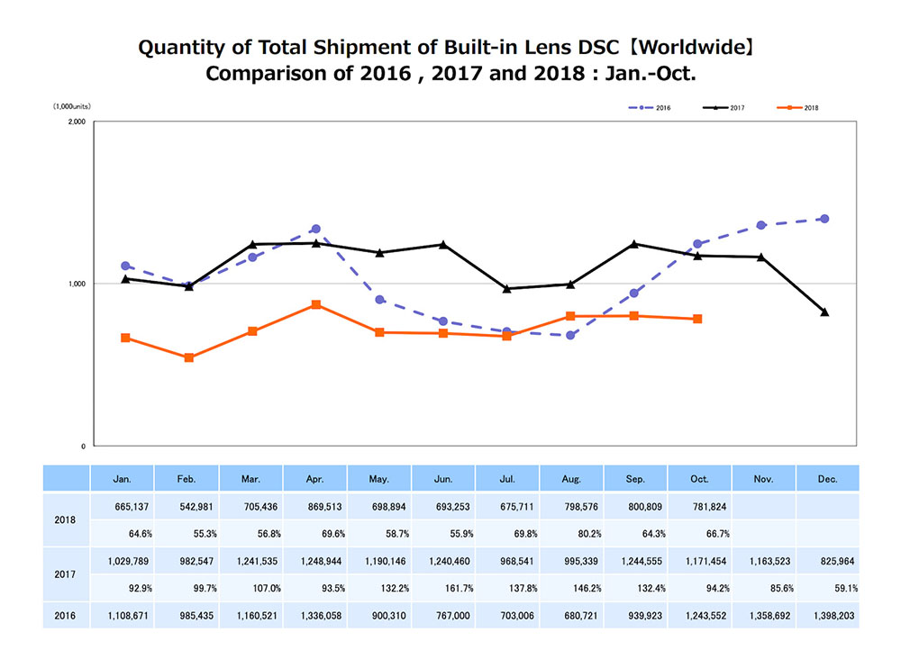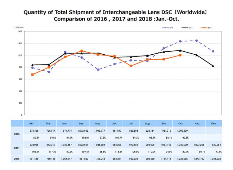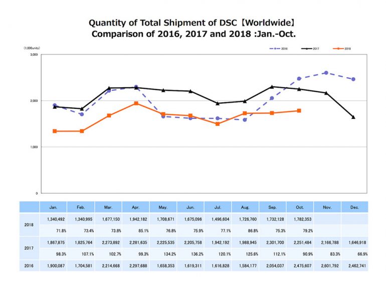 Tous les mois, l’association reporte de plus certains chiffres clés du marché. Parmi les données publiées en ce début de mois de décembre, on peut ainsi découvrir l’évolution du volume de livraisons d’appareils photo numériques (appelés DSC pour Digital Still Camera) de janvier à octobre 2018 (courbe orange), et la comparaison de celui-ci avec les volumes en vigueur pour les années 2017 (courbe noire) et 2016 (courbe violette).