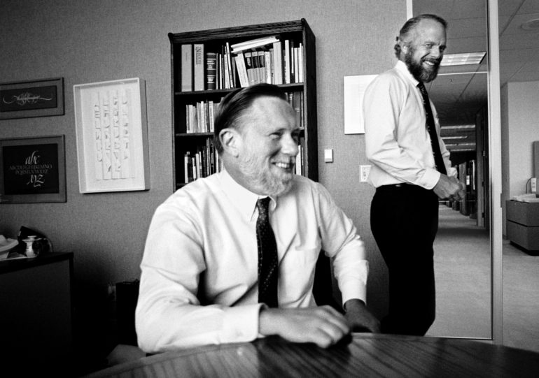 John Warnock et Chuck Geschke, les fondateurs d’Adobe Systems se préparent à lancer Photoshop. Photo Doug Menuez