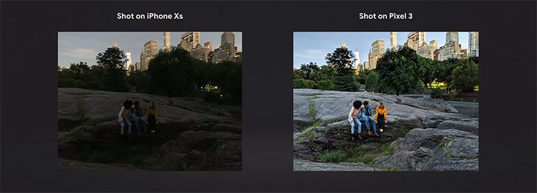Avec Night Sight, Google annonce qu’il n’y aura plus jamais besoin d’utiliser un flash. L’intelligence artificielle est ici en action pour récupérer la lumière nécessaire tout en traitant l’image de manière à éviter bruit et problèmes de couleurs. L’image ci-dessous compare les résultats obtenus avec le dernier iPhone et le Pixel 3.