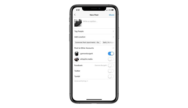 La possibilité de publier simultanément des contenus photo ou vidéo sur différents comptes apparaît après que l’utilisateur ait choisi le média à publier, c’est à dire lors de la rédaction de la légende accompagnant ce même média. Coincés entre l’outil d’ajout d’un lieu et celui permettant la publication sur d’autres réseaux sociaux, apparaissent désormais les différents comptes Instagram auxquels l’utilisateur est connecté – il est donc logiquement possible d’en sélectionner un ou plusieurs.
