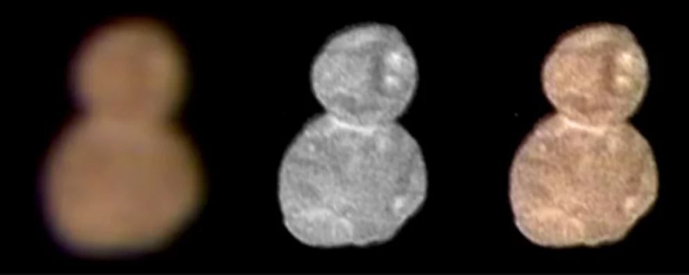 Les images les plus rapprochées viennent de l’appareil Long-Range Reconnaissance Imager (LORRI) et ont été capturées le 1er janvier 2019 à 5h01, heure universelle, 30 minutes avant l’approche la plus rapproché du vaisseaux, à 28,000km de l’Ultima Thule. Le New Horizon a aussi pris quelques images en couleur, ci-haut, grâce à une technologie mélangeant infra-rouges et rayons bleus par le Multispectral Visible Imaging Camera (MVIC) à bord du satellite.
