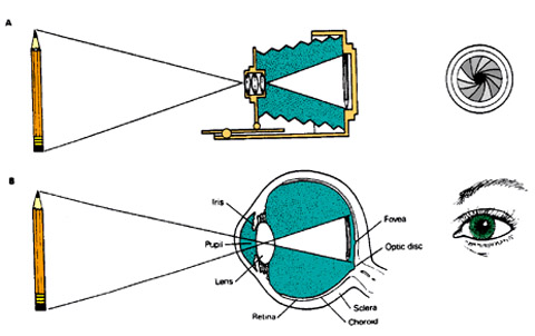 Evitons de faire trop long et trop technique, si vous voulez entrer dans les détails je vous renvoie vers l’article du wikipedia. Le principal c’est de comprendre le phénomène qui permet de former une image sur une surface dans une boite étanche à la lumière percée d’un trou, c’est exactement le même principe qui forme les images dans vos yeux (ça vous épate pas de vous dire que l’image qui se forme dans votre œil est inversée et que nos cerveaux sont habitués?) :