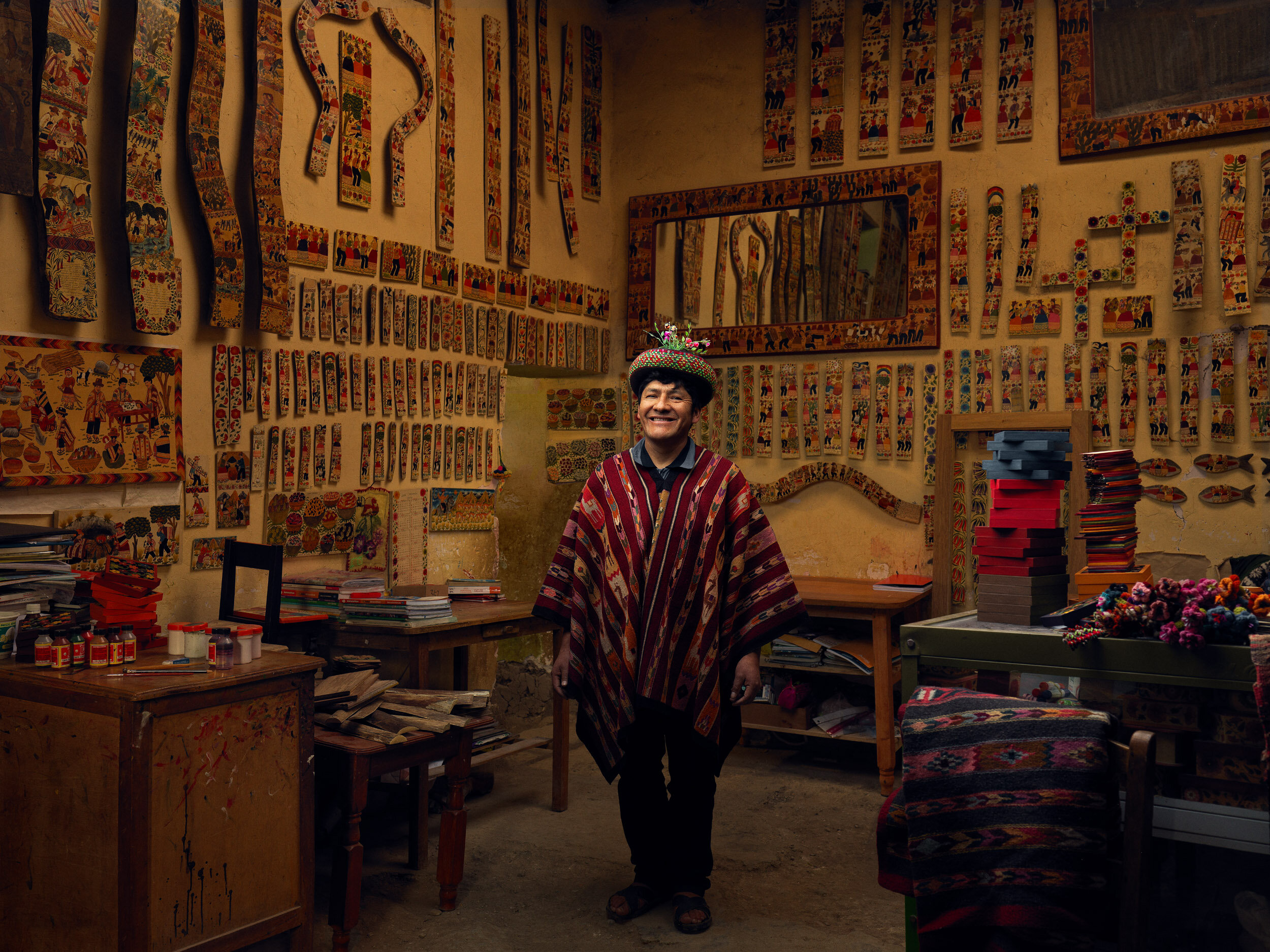 « Ce travail m’a conduit dans les boutiques d’artisanat et les lieux de travail les plus incroyables, où j’ai rencontré les artisans, artistes et travailleurs du Pérou. De Lima au désert de Paracas en passant par Ayacucho, Cuzco, Patacancha, Ica, Nazca et Puno, tous ces gens perpétuent un savoir ancestral souvent utilisé bien avant l’arrivée des Espagnols dans ces terres » explique le photographe.