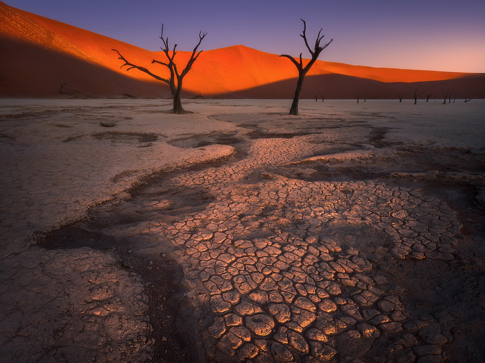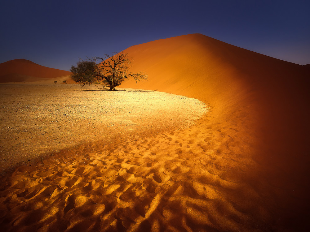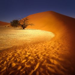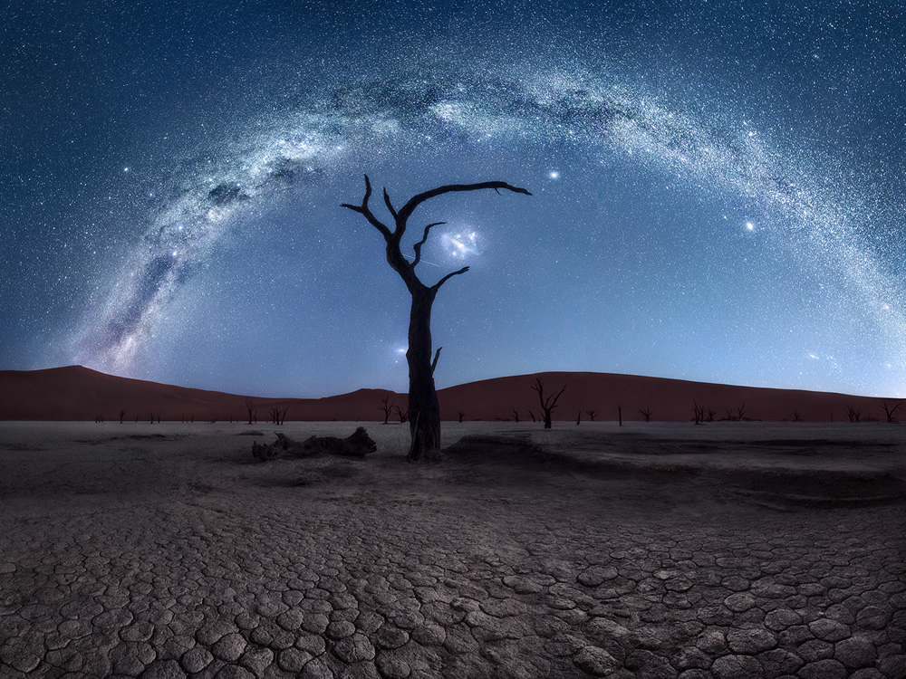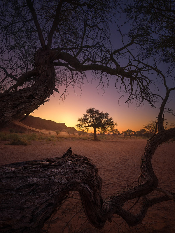 « En particulier dans les régions du désert d’Etosha et du Namib, j’ai capturé quelques arbres solitaires, des âmes isolées dans l’immensité du désert, surmontés dans la nuit pas les plus belles constellations, ou situés près des points d’eau. Les silhouettes de certains arbres permettaient également de donner vie à des compositions photographiques uniques et surmonter l’absence de nuages. » nous a raconté la photographe.