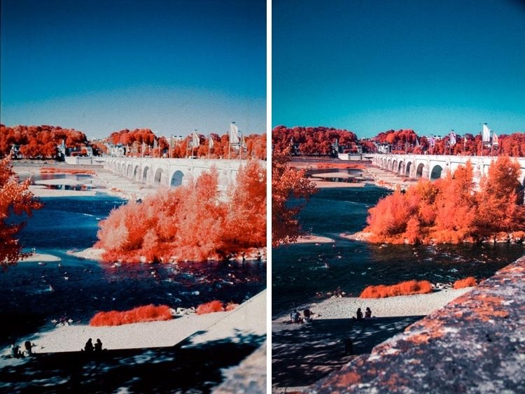 Comme visible sur ce cliché de Yann Philippe, comparant une photo prise au Kodak Aerochrome (gauche) et une avec l’IR Chrome Lens Filter (droite), le résultat est étonnant et traduit parfaitement l’esthétique recherchée.