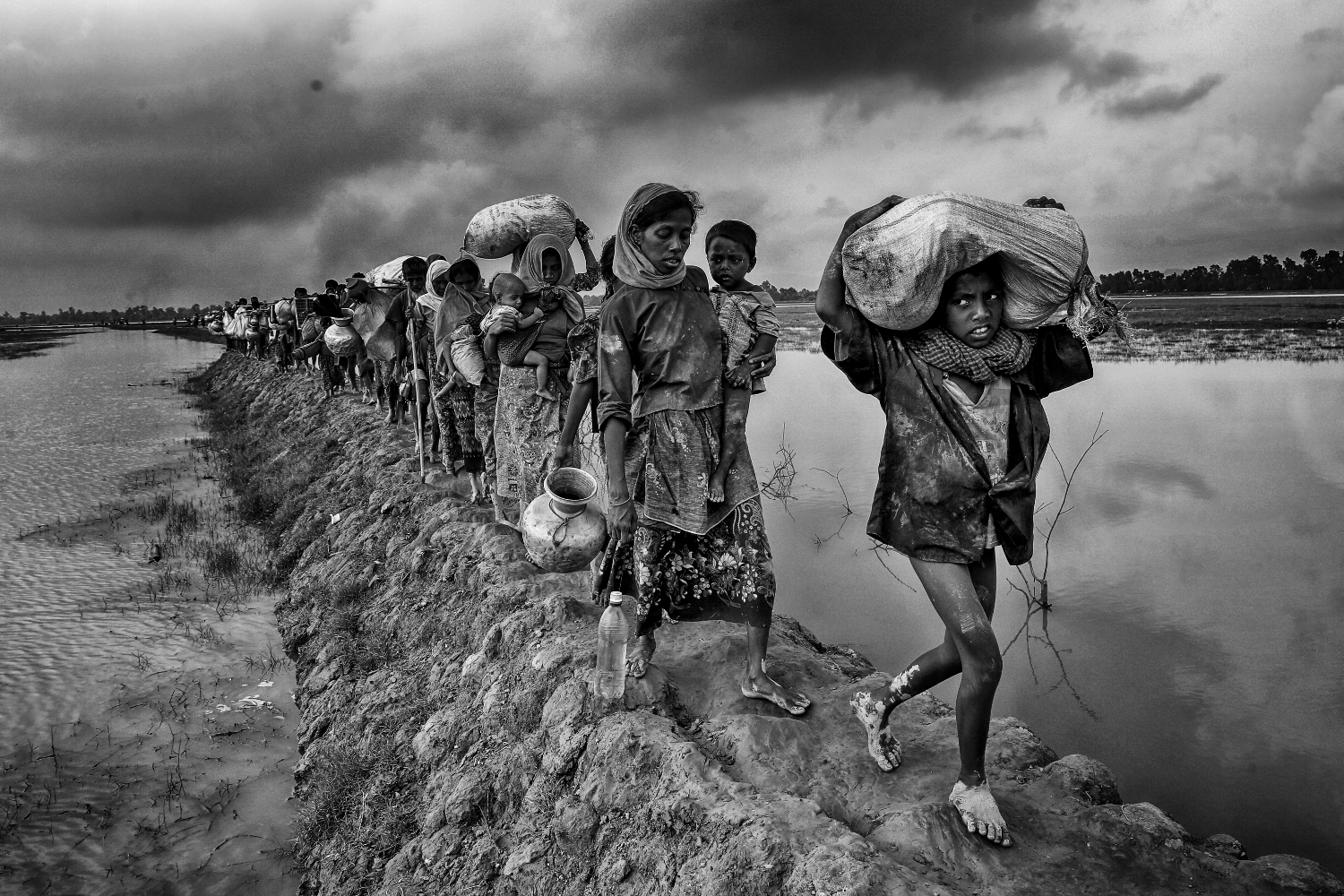 Cette photo bouleversante représente une jeune Rohingya pleurant de fatigue et de peur après l’expulsion de son peuple du Myanmar et une marche épuisante à travers des rizières boueuses. Bazar, Bangladesh le 16 octobre 2017.