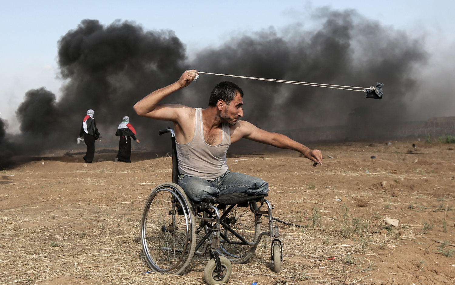 Ce cliché nous montre le palestinien Saber al-Ashkar, 29 ans, en train de lancer des pierres sur la frontière de Gaza lors d’un conflit avec l’armée israélienne. Le jeune a perdu les deux jambes dans le conflit qui a surgi suite à la revendication du peuple palestinien de retourner sur sa terre d’origine.