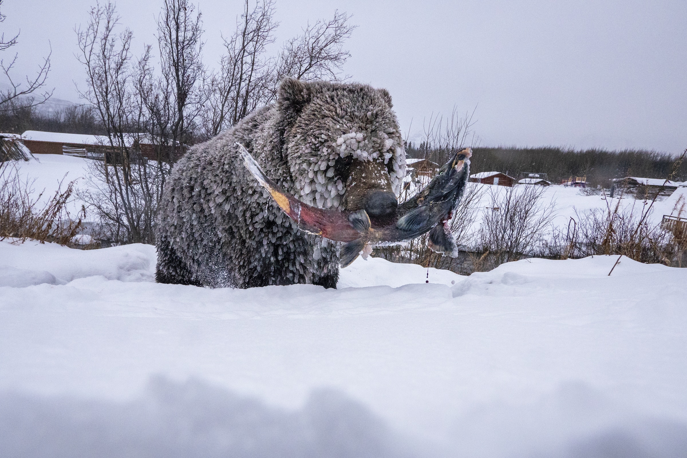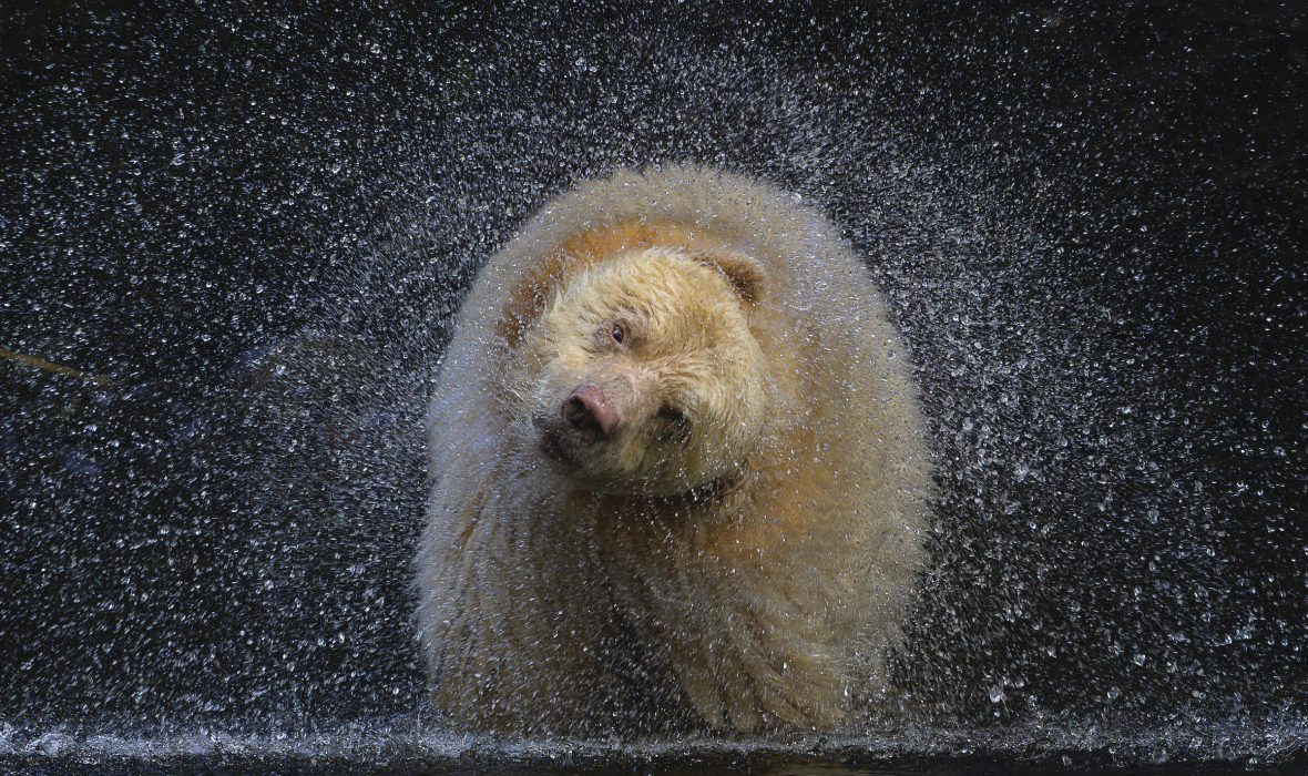 Le cliché de Michelle Valberg (photo d’ouverture), pris sur une île reculée de la British Columbia, remporte la catégorie « Vie terrestre » des BigPicture 2021. Il s’agit du portrait d’un ourse de Kermode en train de chasser du saumon. Chose extraordinaire, le spécimen est blanc alors que cette espèce est composée à 75 % d’ours noirs. Les ours de Kermode blancs ne sont pas albinos mais affichent un gène récessif très rare. La prolifération de ceux-ci sur cette île se justifie par leur capacité à pêcher en plein jour, les poissons ayant du mal à percevoir leur silhouette claire dans la lumière diurne. Les spécimens noirs, quand à eux, sont plus aptes à pêcher la nuit. Cette rencontre photographique ne laissa pas indemne la photographe, qui pouvait à tout moment se transformer en une proie pour l’immense animal : « J’ai eu la gorge serrée », dit-elle de ce moment, qui résume ce que la photographie animalière représente pour elle : la possibilité « de regarder dans les yeux de la nature et de nous y voir reflétés, de comprendre que nous sommes, après tout, intrinsèquement liés. »