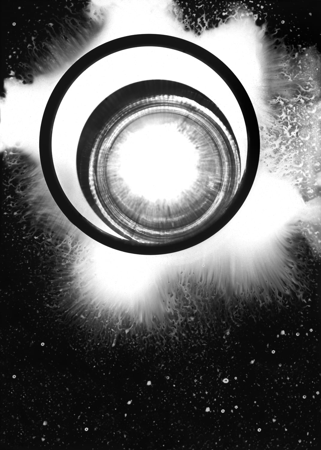 Photographie, photogramme, solarisation, utilisation des négatifs et puis sérigraphies – entre autres – permettent à Sandrine Elberg de retrouver les thèmes qui la fascinent depuis son plus jeune âge : les astres, l’univers, le cosmos. Le réel se confronte alors à des espaces imaginaires, un voile de mystère persiste dans son œuvre. Comme l’indique Marine Dorandeau, autrice des textes de l’exposition, « Dans une installation aux contours immersifs, la galerie propose, comme dans un rêve, un voyage parmi les astéroïdes, les galaxies et les supernovæ : un rêve cosmique. »