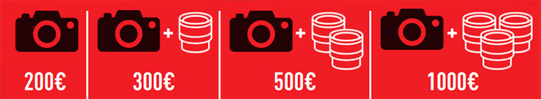 Cela donne un remboursement de 300 € si vous achetez un boîtier (nu ou en pack) avec une optique supplémentaire, de 500 € si vous en achetez deux, et de 1000 € si vous en achetez trois.