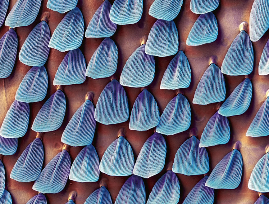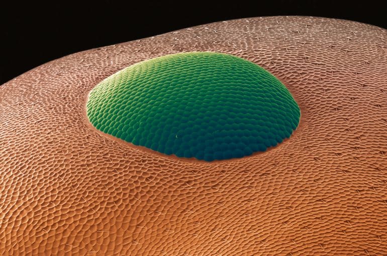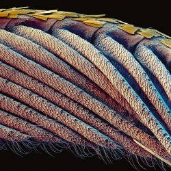 Stephan Borensztajn (suivre sur Instagram) réalise, dès ses premières années d’activités, des photos de divers arthropodes qu’il apprend à coloriser à l’aide d’un logiciel de retouche d’images. Il découvre ainsi progressivement le monde fascinant des arachnides, des insectes et autres arthropodes qui lui offrent sans cesse de nouvelles morphologies extraordinaires à explorer. Courant 2006, le laboratoire s’équipe d’un nouveau microscope électronique à balayage dernière génération (Ultra 55 Zeiss) permettant des observations à haute résolution (1 nm) avec une qualité d’image bien supérieure. Cela lui permet d’élargir son champ d’observation dans tous les domaines y compris celui des arthropodes et il commence alors à diffuser ses micro-photographies colorisées sur Internet, aboutissant à une première exposition en 2010 à Rennes. Encore aujourd’hui, il travaille autour de ces thématiques et s’attèle à parfaire toujours plus la colorimétrie de ses images, sublimée dans Macrocosmos.