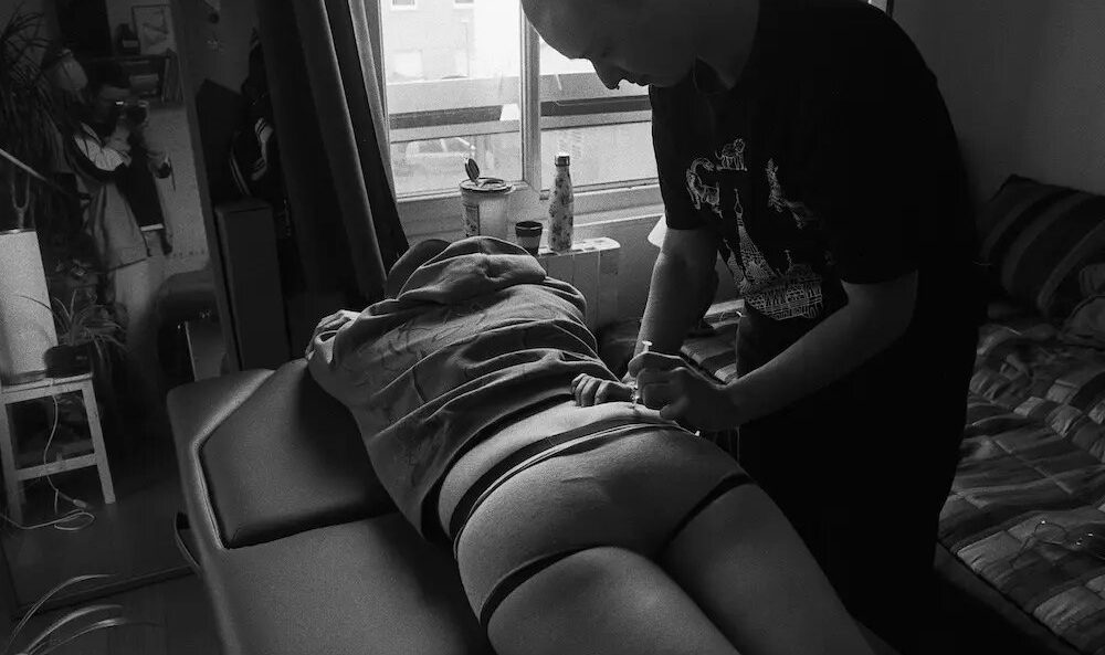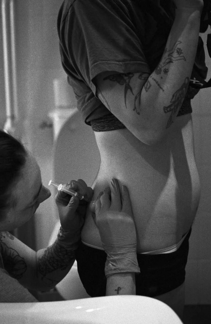 Auteur du livre La nuit t’arrache à moi, Nanténé Traoré côtoie la poésie par les mots et par les images. Dans ce texte bouleversant, lu lors du festival, il raconte la perte de l’être aimé après une overdose. Le deuil est exprimé avec une douceur désarmante, la même que nous retrouvons dans ses clichés, et notamment dans la série Tu vas pas muter. Ces délicates photographies immortalisent les moments de prise de testostérone de personnes en transition. Le photographe souhaitait rendre visibles ces corps, ces instants riches de douceur et de protection mutuelle, d’amitié et de sourires. Comme l’indique l’artiste, le titre de la série vient de son père qui, pour rassurer Nanténé lors de sa transition, s’était exclamé « mais t’inquiète pas, tu vas pas muter ! ».