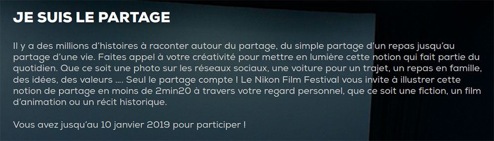 Établi depuis maintenant plusieurs années comme l’une des références en matière de festival français mettant à l’honneur la forme créatrice qu’est le court-métrage, le Nikon Film Festival rassemble pour cette 9ème édition quelque 1 249 films en compétition. D’une durée de 120 à 140 secondes, ces courts-métrages déclinent à l’envi le thématique du partage et peuvent tous être visionnés sur le site internet du festival. Pour faciliter le visionnage, l’organisation du concours propose des rubriques rassemblant les films les plus vus, les plus soutenus, les plus récents et les films d’écoles.