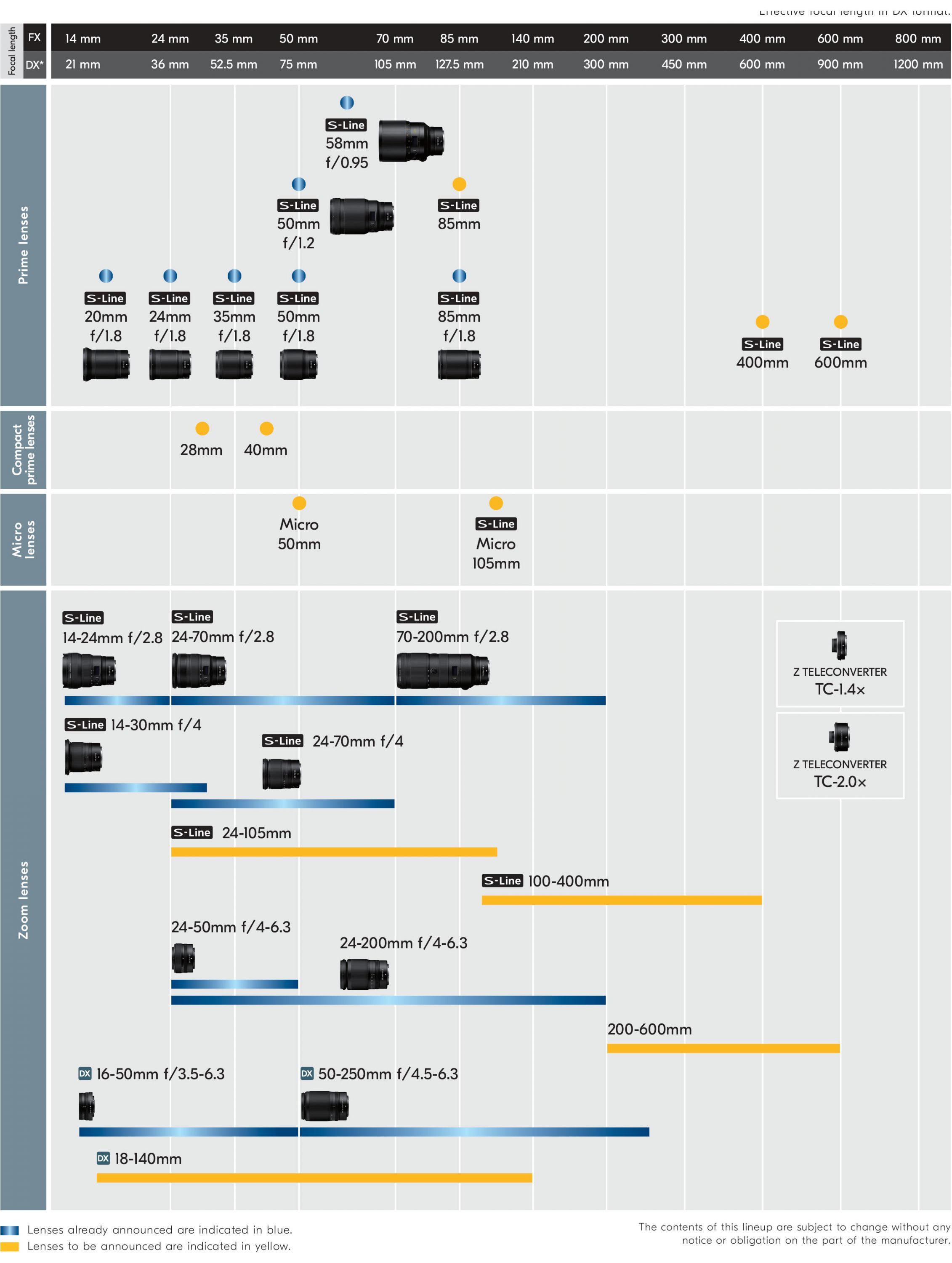 Nikon s’engage à proposer 24 optiques natives en monture Z d’ici la fin de l’année 2021, et dévoile une nouvelle roadmap qui pousse jusqu’a 2022. On note les 400 mm et 600 mm.