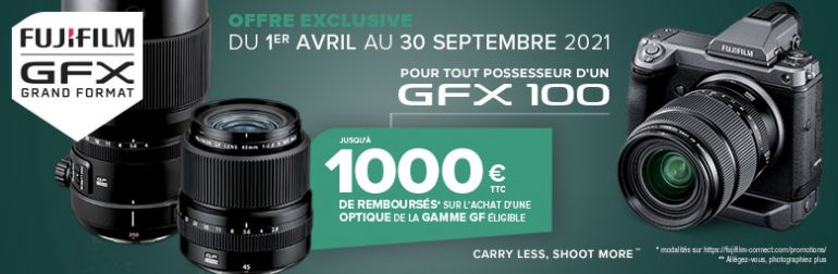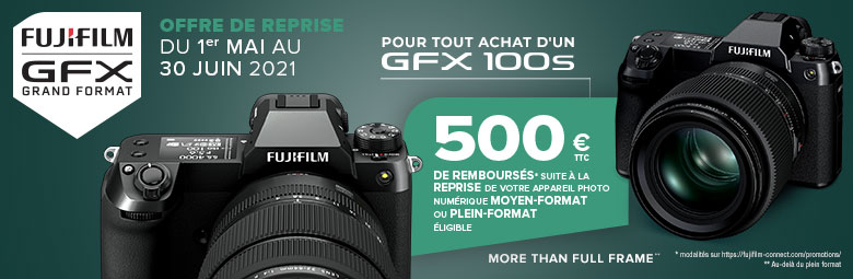 Enfin, le constructeur propose une offre de reprise de votre appareil moyen format ou plein format (s’il est éligible) pour l’achat d’un GFX100s. L’offre se monte à 500 €.