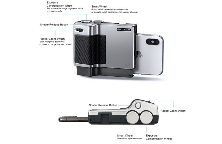 On retrouvera les éléments qui ont fait le succès du premier modèle Pictar. Le Pictar Pro propose donc toujours un grip pour une bien meilleure prise en mains. Le déclencheur physique offre, comme sur un appareil photo dédié, la possibilité d’appuyer à mi-parcours pour la mise au point, puis de déclencher en appuyant un peu plus.