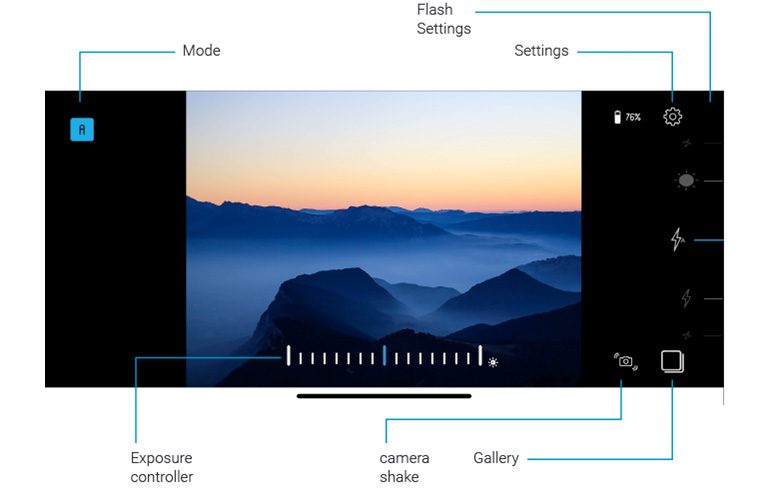 L’interface permet d’accéder de manière visuelle et intuitive aux réglages généraux, aux réglages du flash, indique la stabilisation, et permet de voir si son exposition est correcte.
