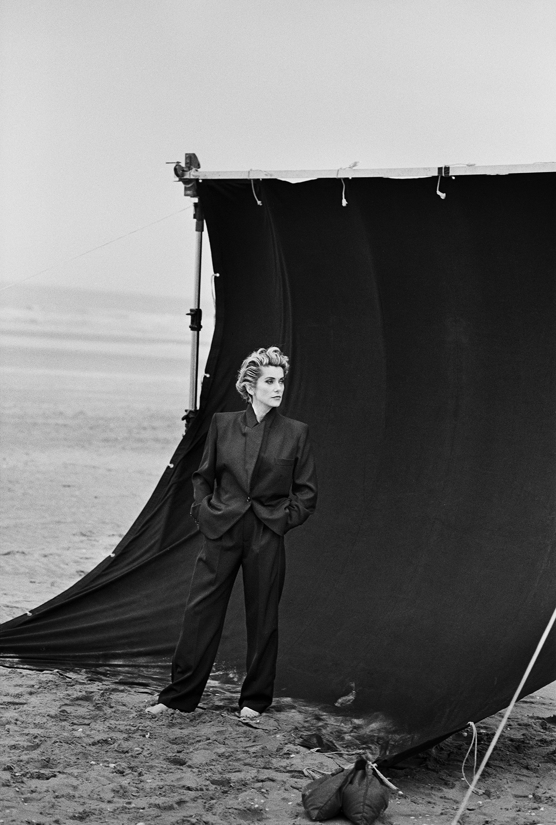L’intensité du vent ne suffit pas à décourager le public qui suit le parcours jusqu’à la plage où les images du photographe de mode Peter Lindberg sont disposées à même le sable dans une installation monumentale. Présentées pour la première fois en extérieur, les images emblématiques du photographe star sont exposées sur les lieux mêmes où elles ont été réalisées, comme ce cliché de Catherine Deneuve en 1991.