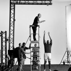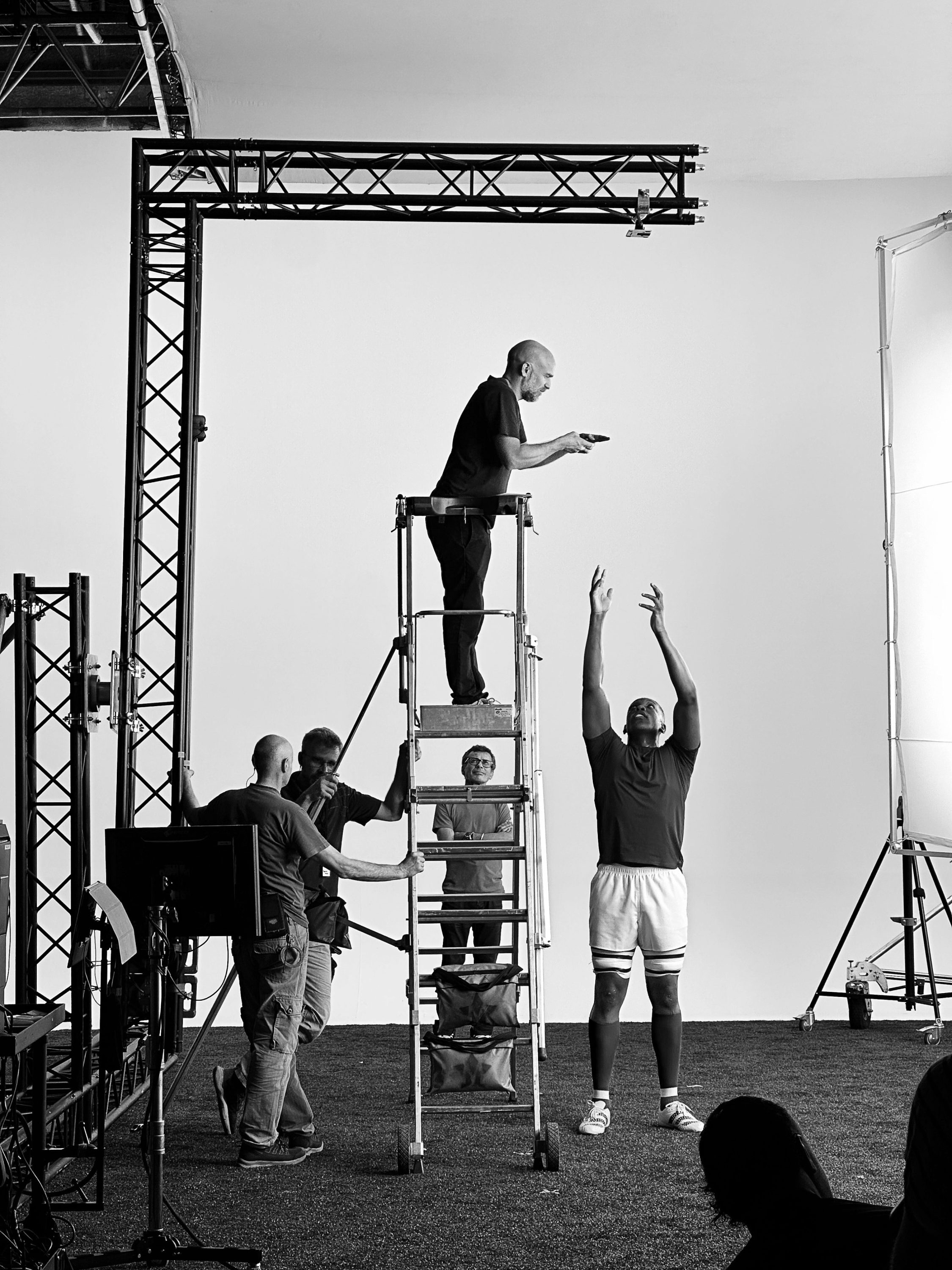 Nous avons capturé les images dans un studio à Paris. Nous avons utilisé des lumières continues assez puissantes pour figer le mouvement. Nous avons construit un mini-terrain en gazon synthétique pour que les joueurs puissent se déplacer en toute sécurité avec leurs crampons. Les joueurs ont été photographiés contre un fond cyclo blanc.