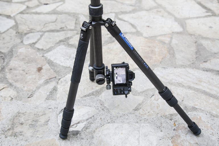 La bonne surprise venant de sa colonne qui au choix se démonte ou se renverse. Il est alors possible de venir ne fixer que la rotule sur la tête du trépied, et réduire à seulement 21 cm la hauteur de prise de vue, soit de la retourner donc pour des prises de vue ultra rapprochées du sol. Là encore le système de friction permet des réglages rapide et sans prise de tête. Nous sommes sans doute un peu moins précis qu’avec un système à trois ou quatre axes de verrouillage indépendant, mais quel confort, surtout dans cette position la tête en bas.