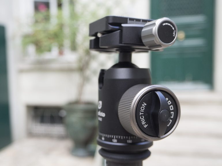 La rotule XB-32 quant à elle est équipée d’un rotule ball 3D avec plaque de connexion rapide BPL-50 qui se visse sous la semelle du boîtier et est compatible Arca-Swiss. La rotule est équipé d’un niveau à bulle et surtout d’un mécanisme de réglage à friction via deux molettes. L’une permet d’opter pour un réglage panoramique et l’autre permet d’ajuster l’angle d’inclinaison de la rotule. Un réglage situé à l’intérieur de cette seconde molette permet d’ajuster la friction : plus cette vis est serrée plus il faudra forcer pour ajuster la tête de la rotule pour plus de précision et inversement afin de changer rapidement de position. Notez enfin que la rotule promet de supporter des charges jusqu’à 10 kilos.