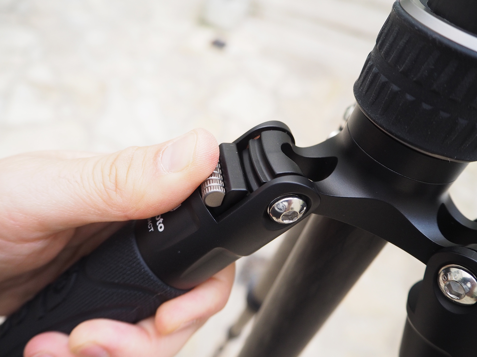 Les finitions sont d’un très bon niveau et n’ont rien à envier à des modèles concurrents. Les molettes de réglages ne présentent pas non plus de point durs, et le système d’ajustement Twist ‘n lock pour régler la hauteur de jambes ne présente pas de jeu non plus. Tout juste sommes nous un peu dérouter au début par le système de blocage des angles d’inclinaison car il faut, avant de pouvoir appuyer sur le levier qui permet de déverrouiller cet angle d’inclinaison, appuyer légèrement sur la jambe d’abord, afin de libérer la contrainte. Une fois le système compris on s’y habitue rapidement.