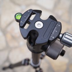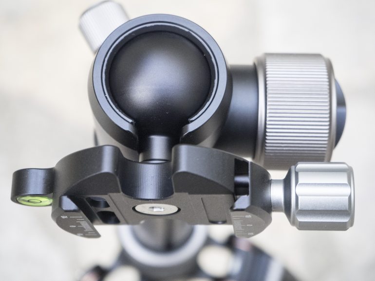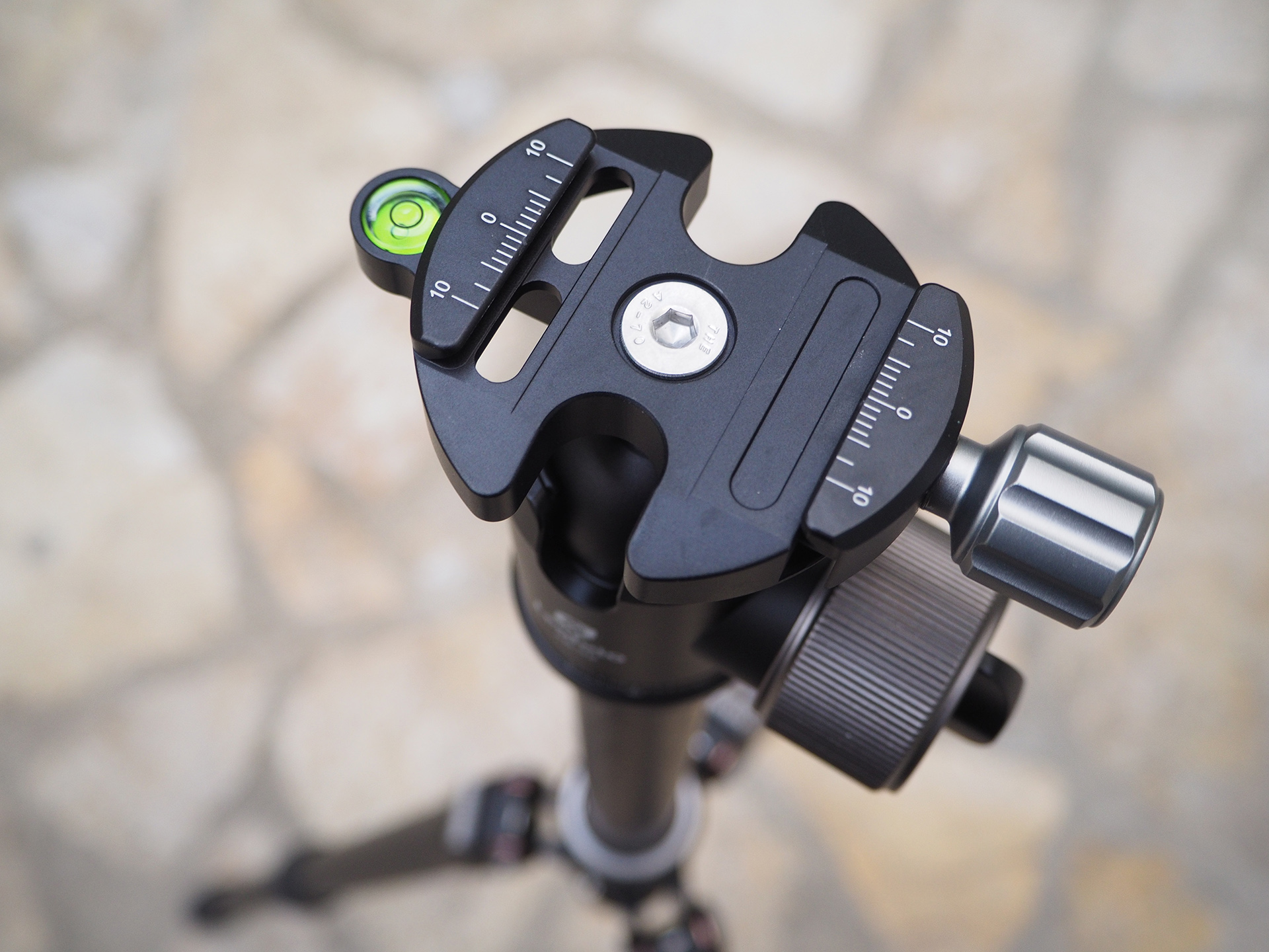 Une fois positionné sur la base de la rotule, il n’y a pas de système d’arrêt qui l’empêche de glisser ou de tomber. Il est impératif de retenir le matériel avec une main pendant que l’on dévisse le plateau sous peine de voir son boîtier chuter. Ce point est assez dommageable au regard du positionnement haut de gamme du trépied. Et, puisque nous en sommes à critiquer la rotule, notez que d’une part la vis qui permet de serrer le dit plateau est trop prêt du boîtier, ce qui fait que la manipulation est peu aisée ; et enfin le niveau à bulle, une fois le boîtier posé sur la rotule, devient difficilement lisible.